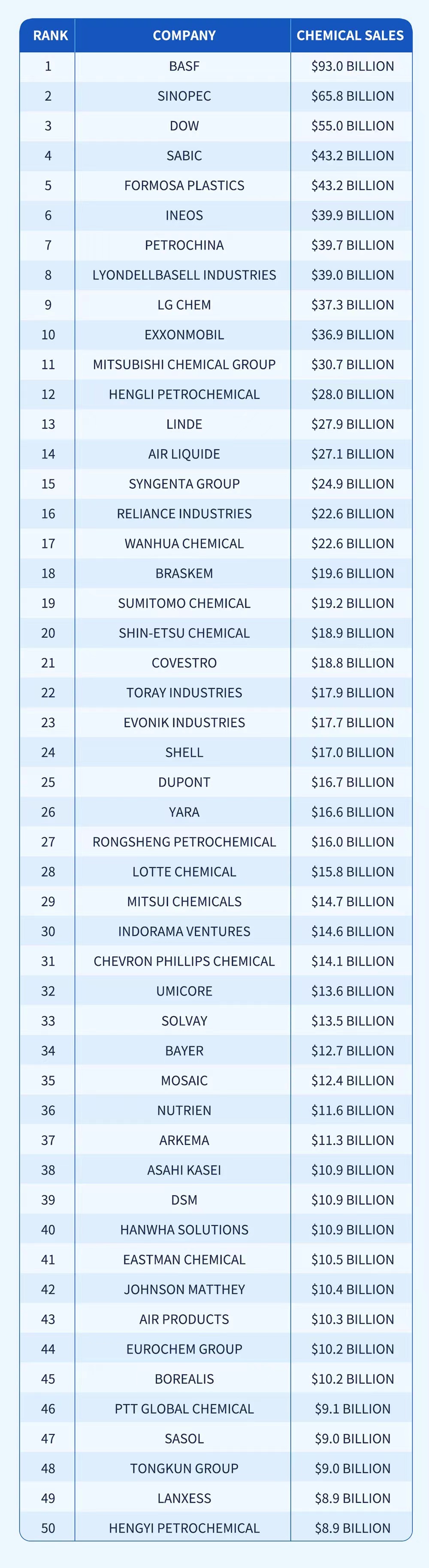 On July 25th, Chemical & Engineering News (C&EN) released its Global Top 50 Chemical Companies for 2022. Wanhua Chemical ranks 17, and this is the fifth consecutive year that we are listed in it.