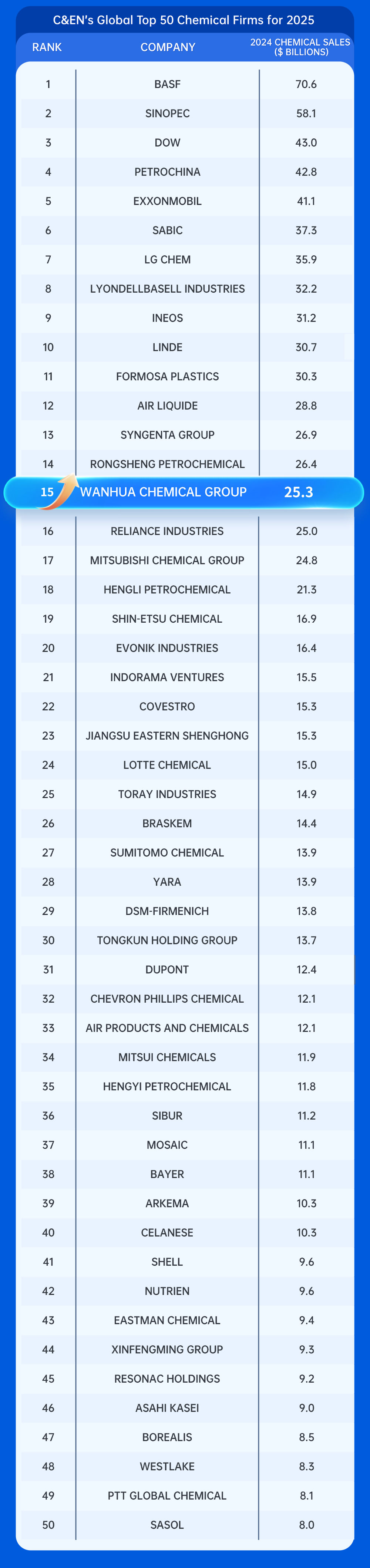 On July 23rd, C&EN (Chemical & Engineering News) released its Global Top 50 Chemical Firms for 2025, with Wanhua Chemical ranking 15th, moving up one position from last year.